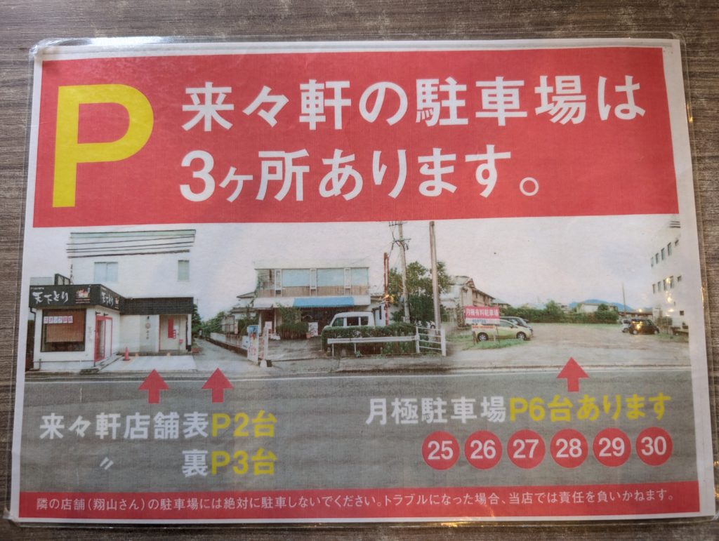駐車場は3ヶ所あり、お店の前、月極駐車場の25番から30番に止めることが出来ます。