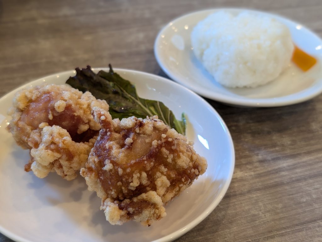 おにからセット(550円)も注文しました。大ぶりのからあげが2個と白おにぎりです。からあげはカラッと揚げられていてサクサク食感です。中は肉やタレの旨みが感じられるほどジューシーでごはんが進むからあげでした。からあげはお店横に併設されている「天下とり」でテイクアウト出来ます。