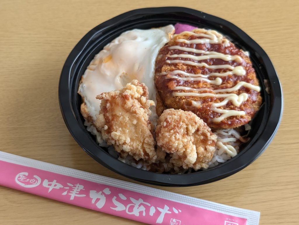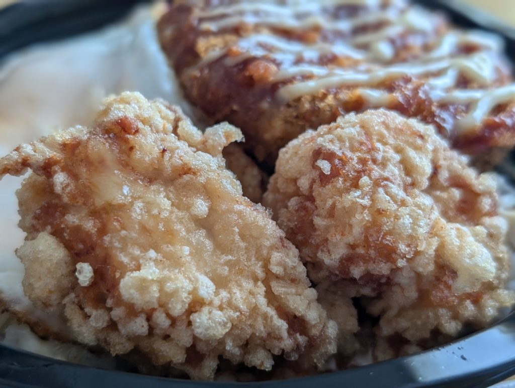 特デミカツ丼の特はからあげが2個付いています。衣がサクサクして、胸肉ですが、ふわっと柔らかい食感でした。