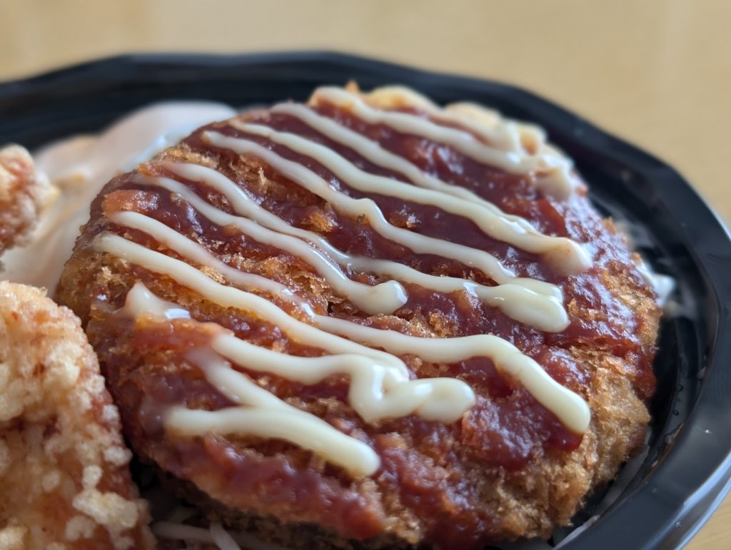 デミカツはメンチカツにソースとマヨネーズがかかっていて、目玉焼き付きです。