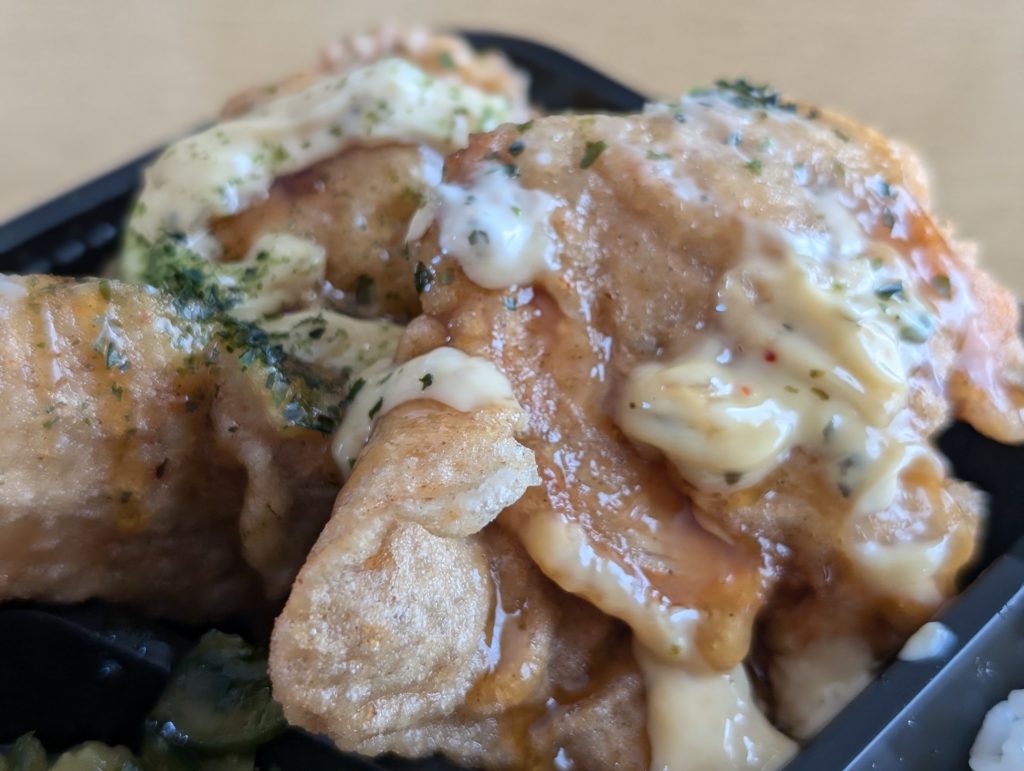 大きめにカットされた鶏肉がお弁当箱からはみ出すほど山盛りです。鶏むね肉でやわらかく、ジューシーさがありました。