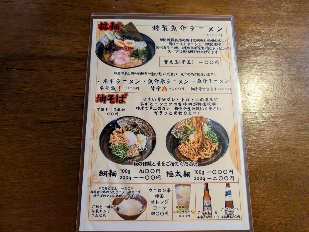 店内はカウンター席のみとなっていて、こぢんまりとしています。メニューは油そばと魚介ラーメンとなります。
