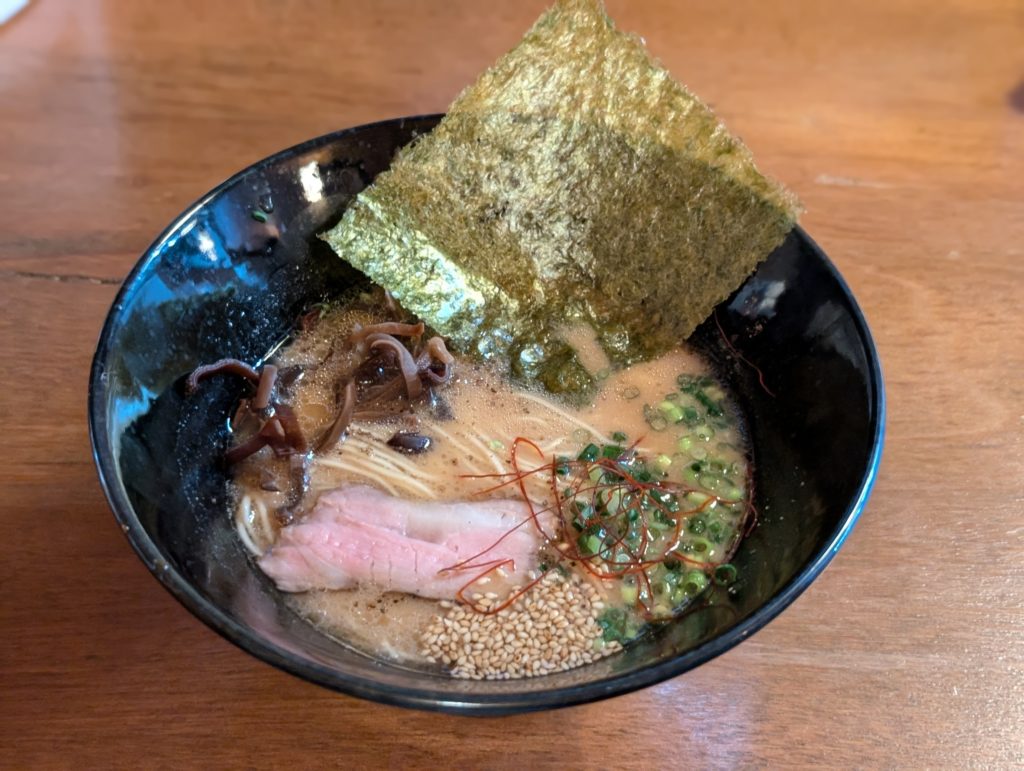 こちらは魚介ラーメン(850円)です。海苔、ねぎ、きぐらげ、豚肩ロースのチャーシューがトッピングされていました。