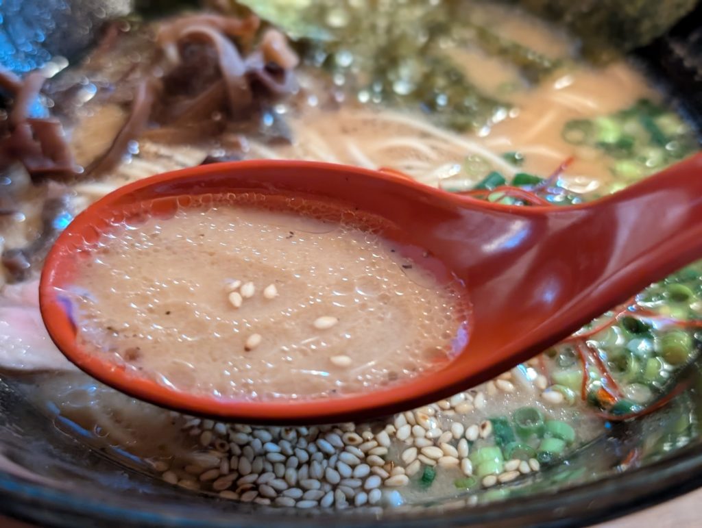 スープは豚骨のような色をしていますが、豚骨は使っておらず、鯛、鰹、昆布の出汁にゴマと味噌のタレとなっています。豚骨かのようなコクがあって、魚介の風味が口の中で広がります。