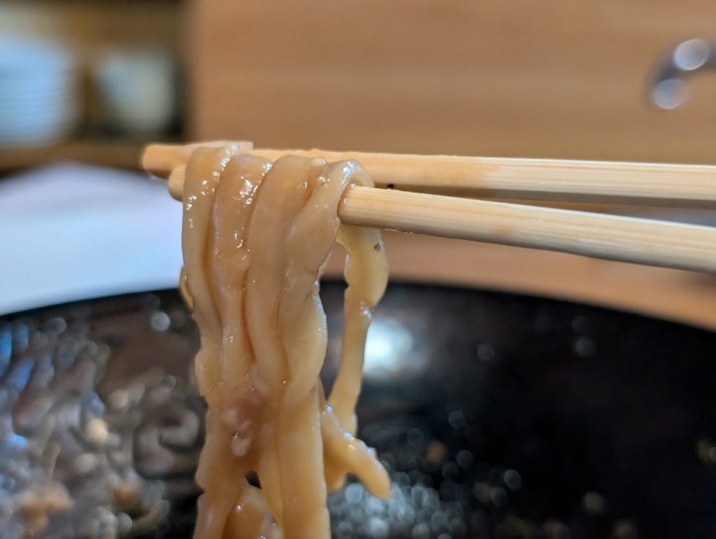 甘辛い醤油ダレと温玉が極太麺にしっかり絡みます。そして香味油の香りが広がります。細麺と太麺とあるので、麺によってタレの絡み方も変わってくるようです。
