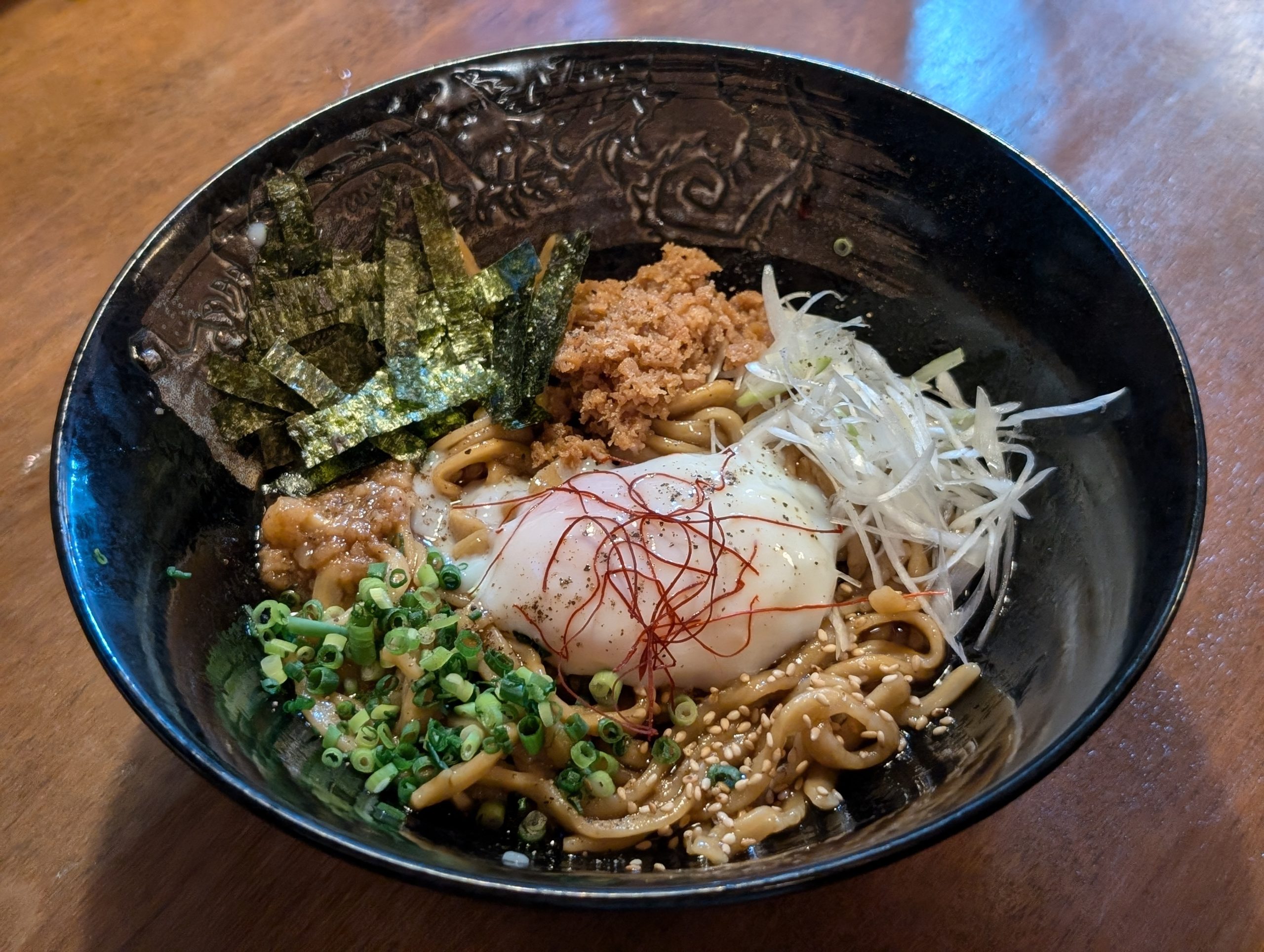 油そばの極太麺100g(1,000円)を注文しました。きざみのり、肉味噌、白ネギ、青ネギ、温玉です。具材とタレをしっかり箸で混ぜ合わせます。