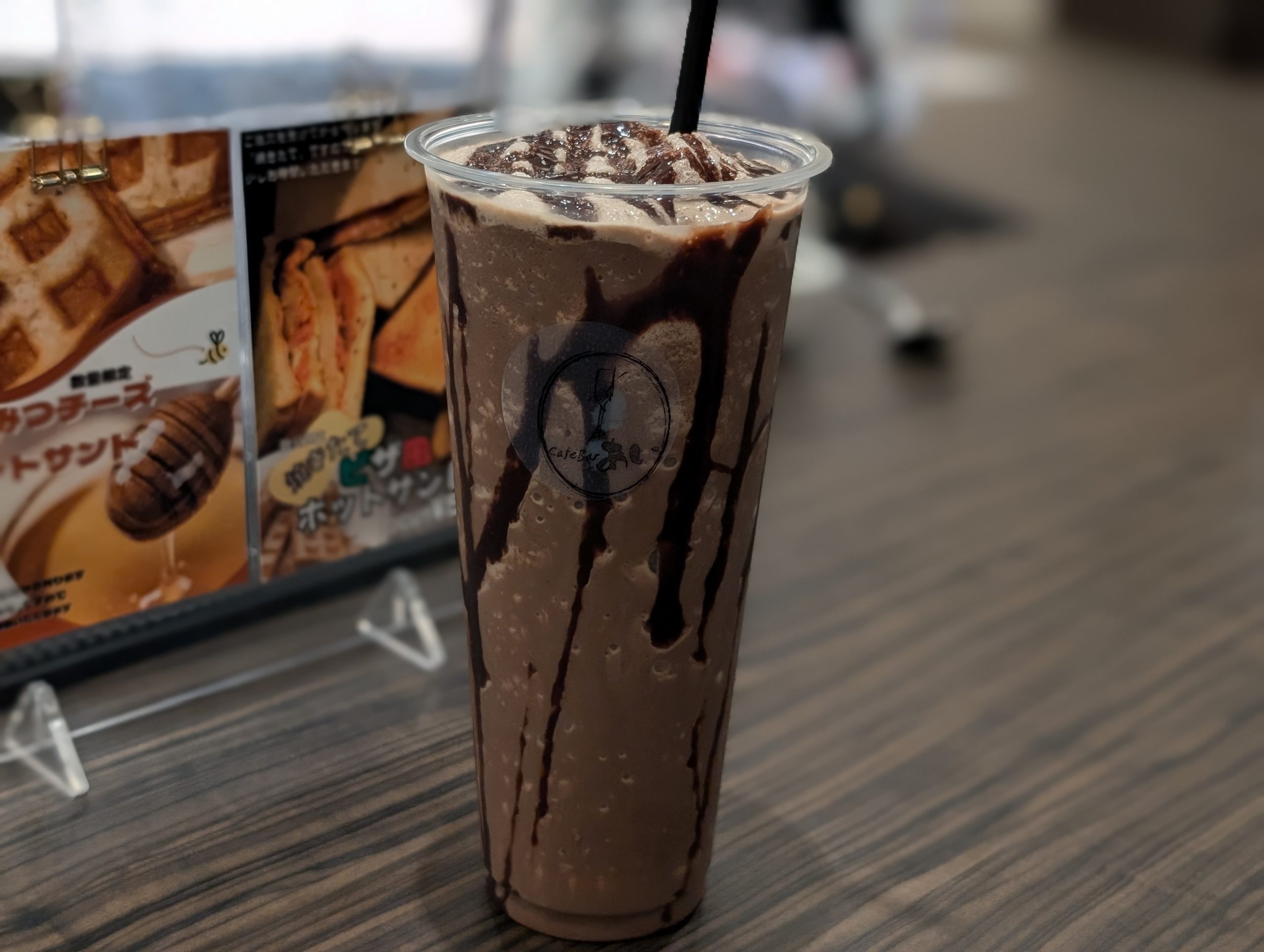 こちらはチョコフラッペ(550円)です。25cmほどある大きなカップにたっぷりのチョコフラッペはボリューム満点です。チョコの甘さが心身ともに癒してくれます。