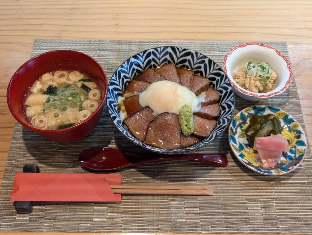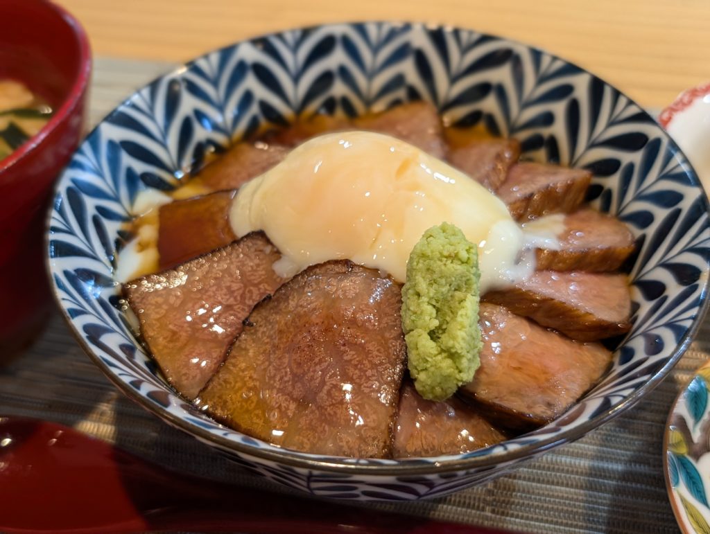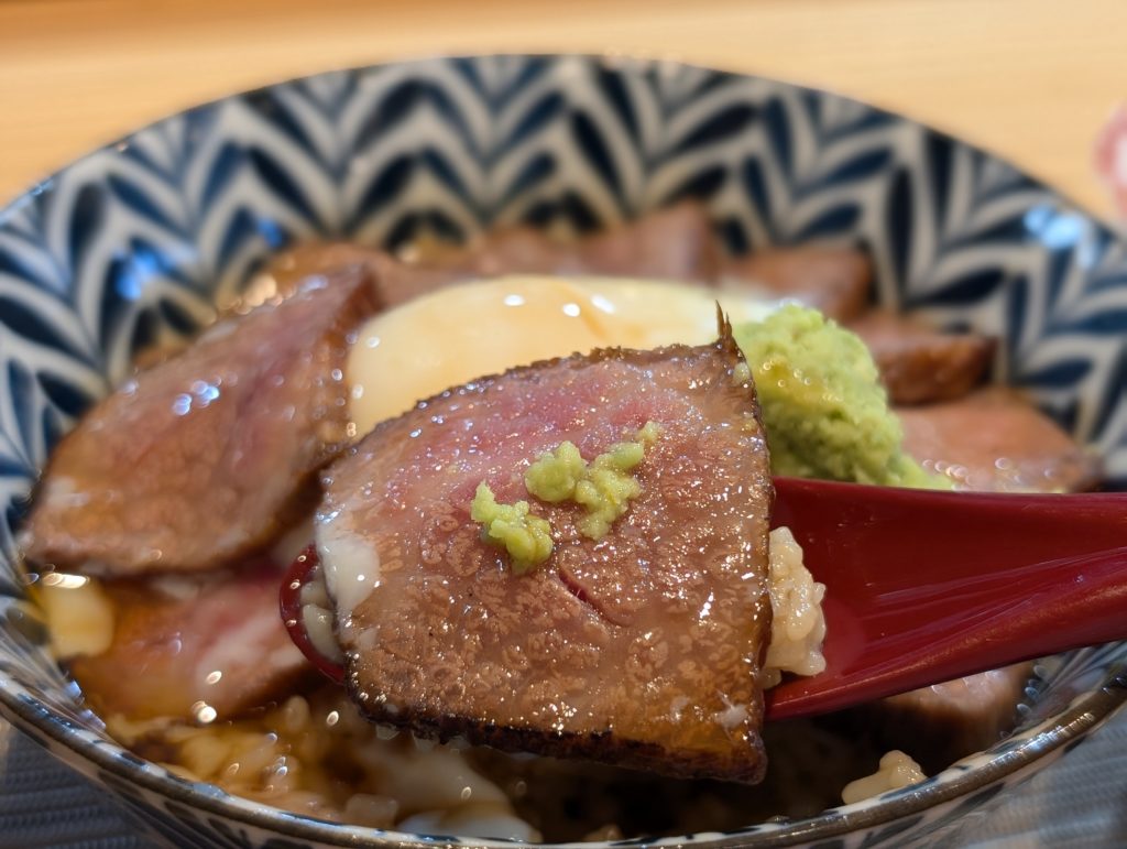 ごはんが見えないほどのたっぷりのお肉で覆われています。黒毛和牛の希少部位を低温調理しているローストビーフの上には温泉たまごが乗っていてキレイな盛り付けに目が奪われました。