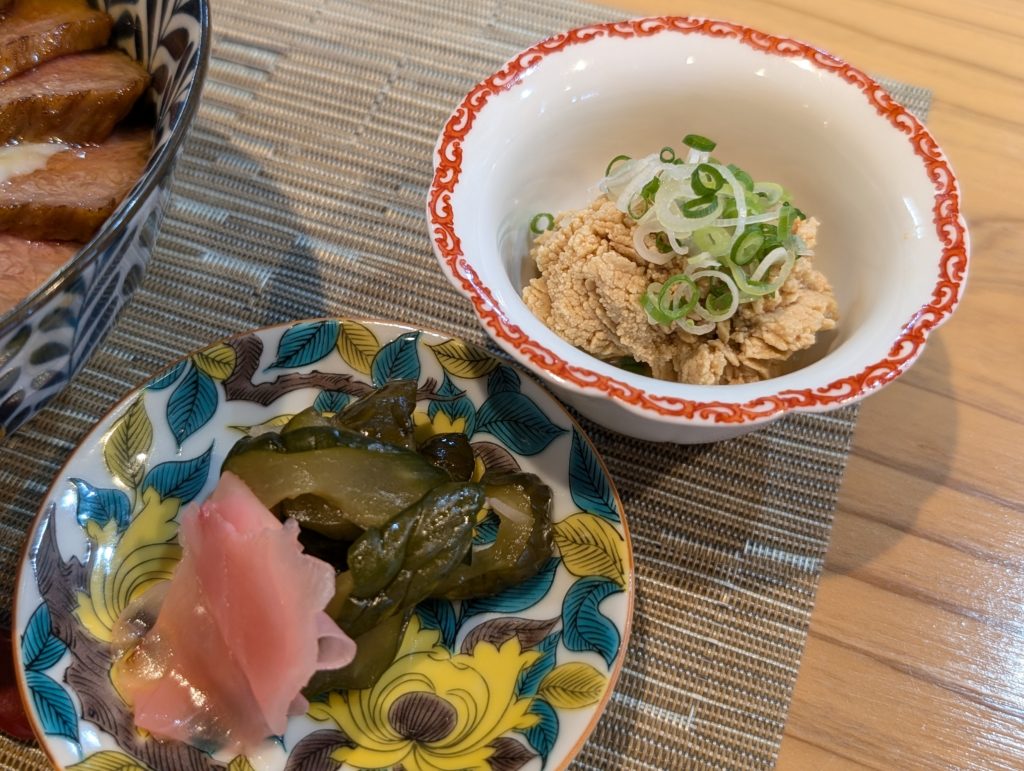注文したのは「黒毛和牛のどんぶり(2,200円)」です。味噌汁、小鉢、漬物がセットとなっています。
