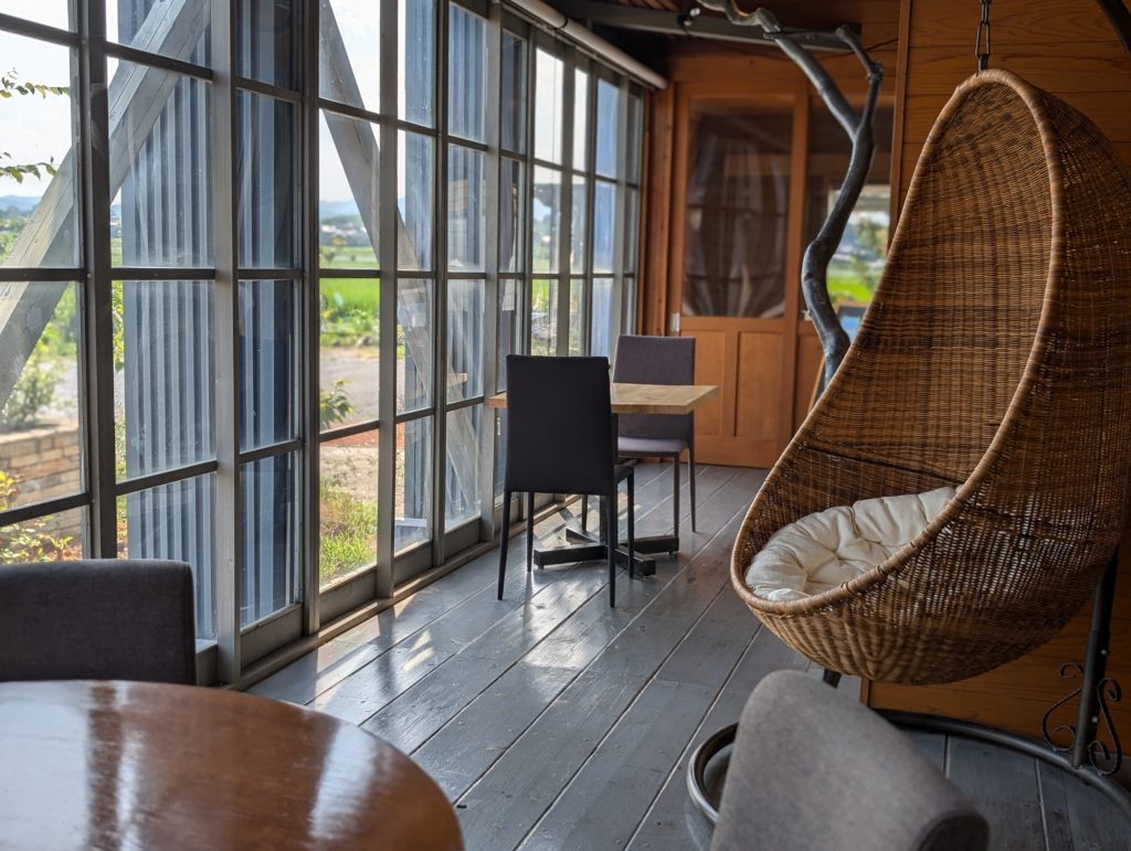 靴を脱いでスリッパに履き替えて店内に入ります。ガラス張りの店内は日差しが差し込んで開放感があります。