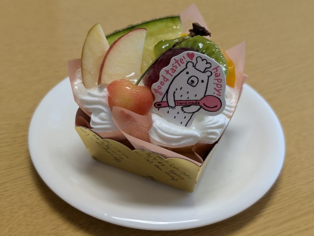 シフォンケーキ(496円)のスポンジの中にはカスタードクリームが入っていて、生クリームの上にはフルーツがたっぷりです。シフォンケーキもクリームもふわふわ食感でした。