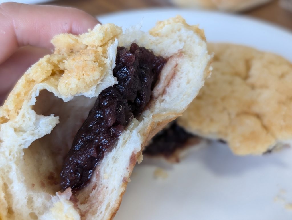 和風メロンパンあんこ&きなこ(150円)。の外側はサクサクの生地で生地の上にはきな粉がかかっています。中には粒あんがびっしりと入っていました。