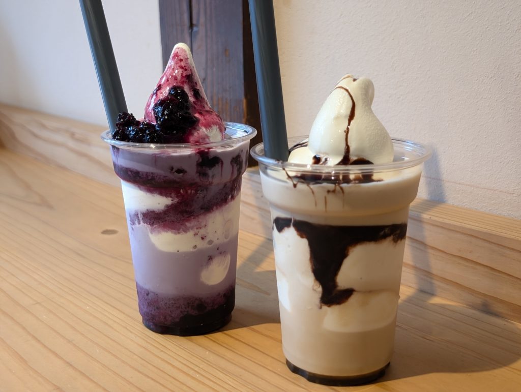 パン同様に常連さんに人気なのが「シェイク」です。シェイクの種類は日によって違います。この日のシェイクメニューからブルーベリーとコーヒーを注文しました。