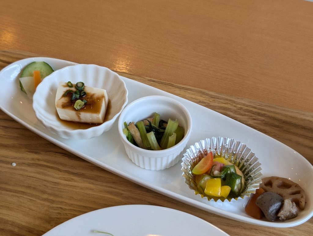 小鉢は漬物、冷奴、小松菜の和え物、ピクルス、煮物です。