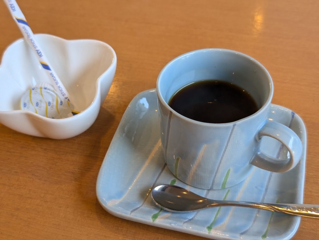 食後にドリンクが付きます。コーヒー、紅茶、オレンジジュースと選べるのでホットコーヒーにしました。