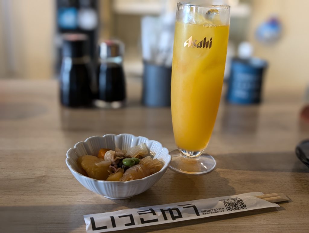 席に着き、ドリンクを注文すると一緒にお通しが運ばれてきました。この日のお通しは味がしっかりと染み込んでいた肉じゃがでした。