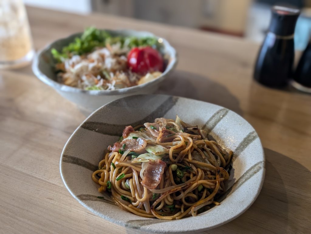野菜サラダ(688円)と醤油焼きそば(780円)を注文しました。コクのある和風やきそばで箸が止まることなくあっという間に食べてしまいました。