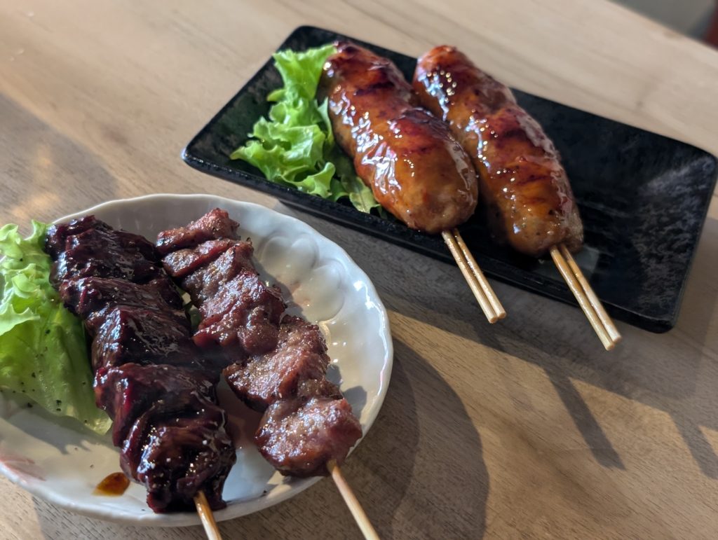 串焼きの厚切り牛タン(380円)と厚切りさがり(380円)と鶏つくね(250円)です。牛串はどちらも肉厚でレア気味の焼き加減なので肉の旨みを感じることができ、食べごたえがあります。