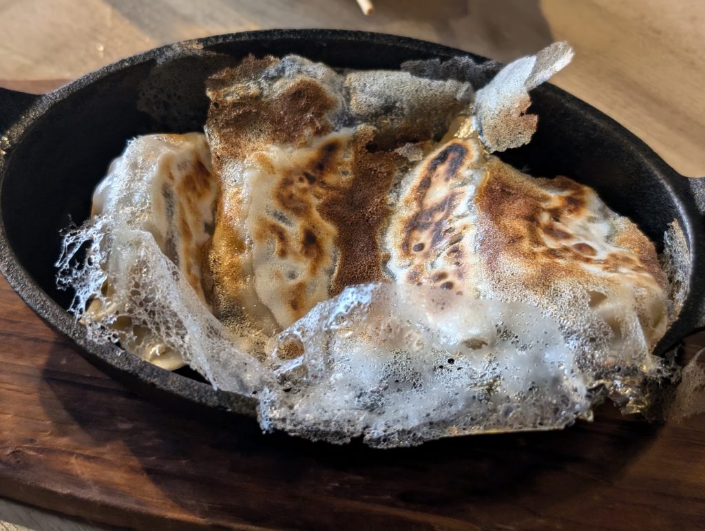 羽根付き焼きぎょうざ(580円)です。鉄皿に盛られたぎょうざはアツアツで中の具材にはしっかりと味が付いていました。タレは付けないほうが具材の味を感じることが出来ると思います。
