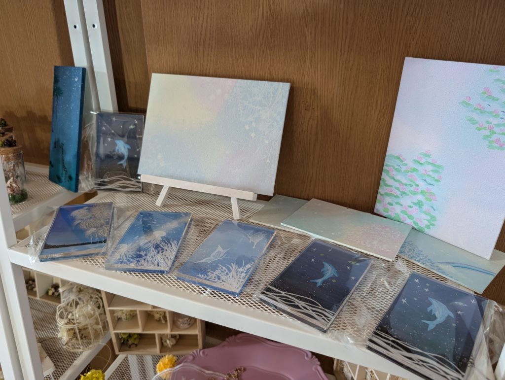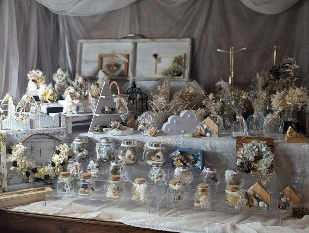 オーナーのしっぽさんの雑貨(商品の一部)です。こちらはプリザーブドフラワーです。多彩なしっぽさんは雑貨、アクセサリー、イラストと癒される商品がたくさんあります。