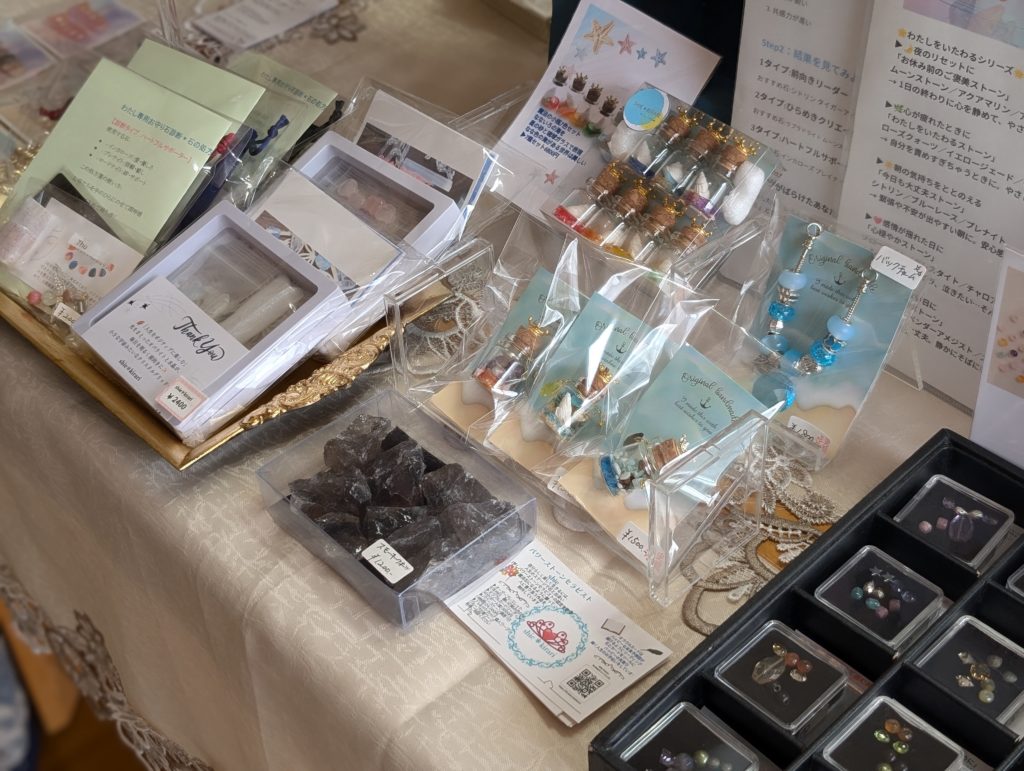 天然石を使った雑貨です。天然石は透明感が魅力的で光を反射して輝きます。天然石によっていろんな意味合いがあるので自分に合った石を見つけるのも楽しそうです。