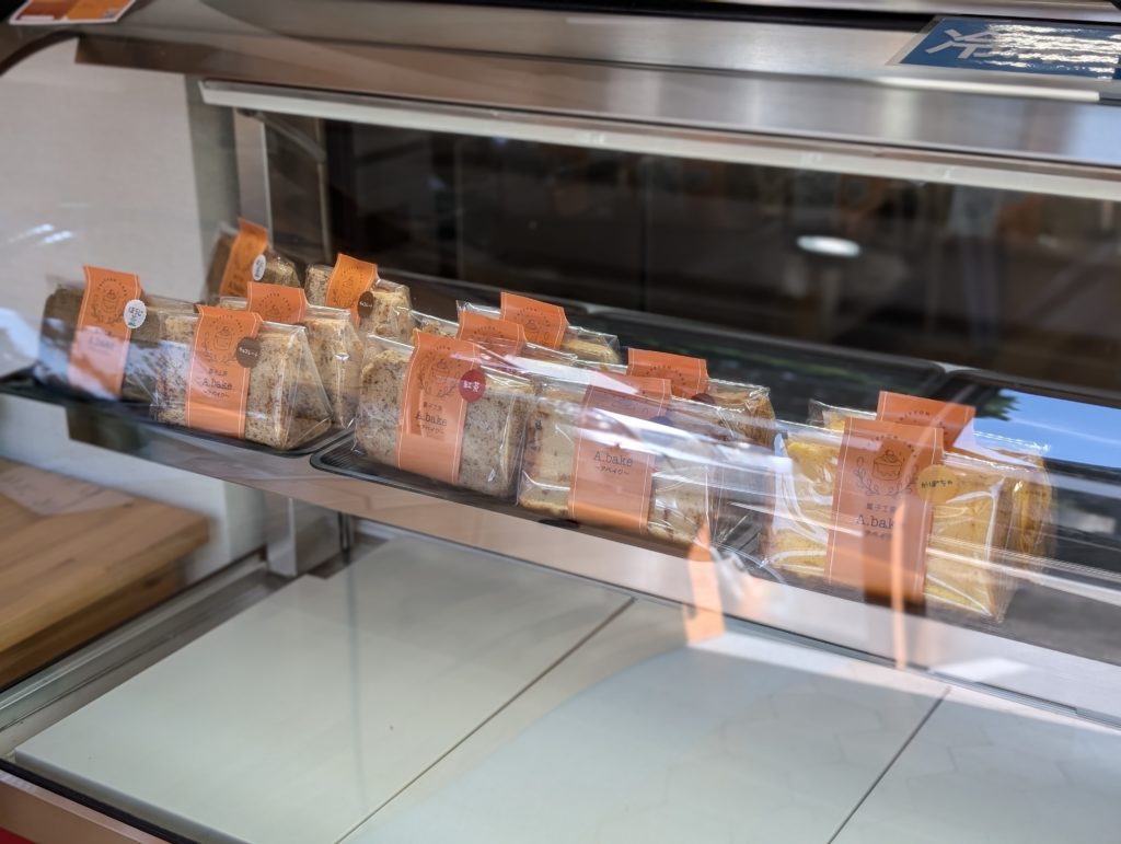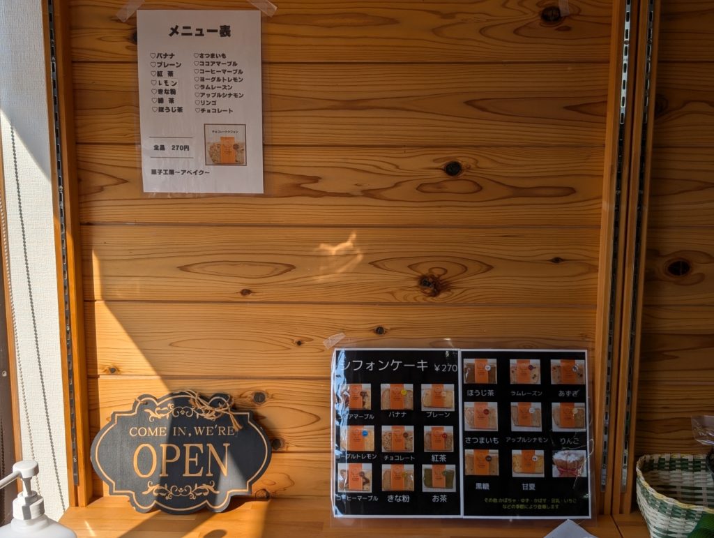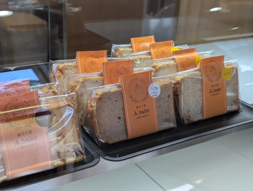 アベイクはシフォンケーキの直売工房となっていて、店内に入るとすぐにシフォンケーキがガラスケースに並べられていました。