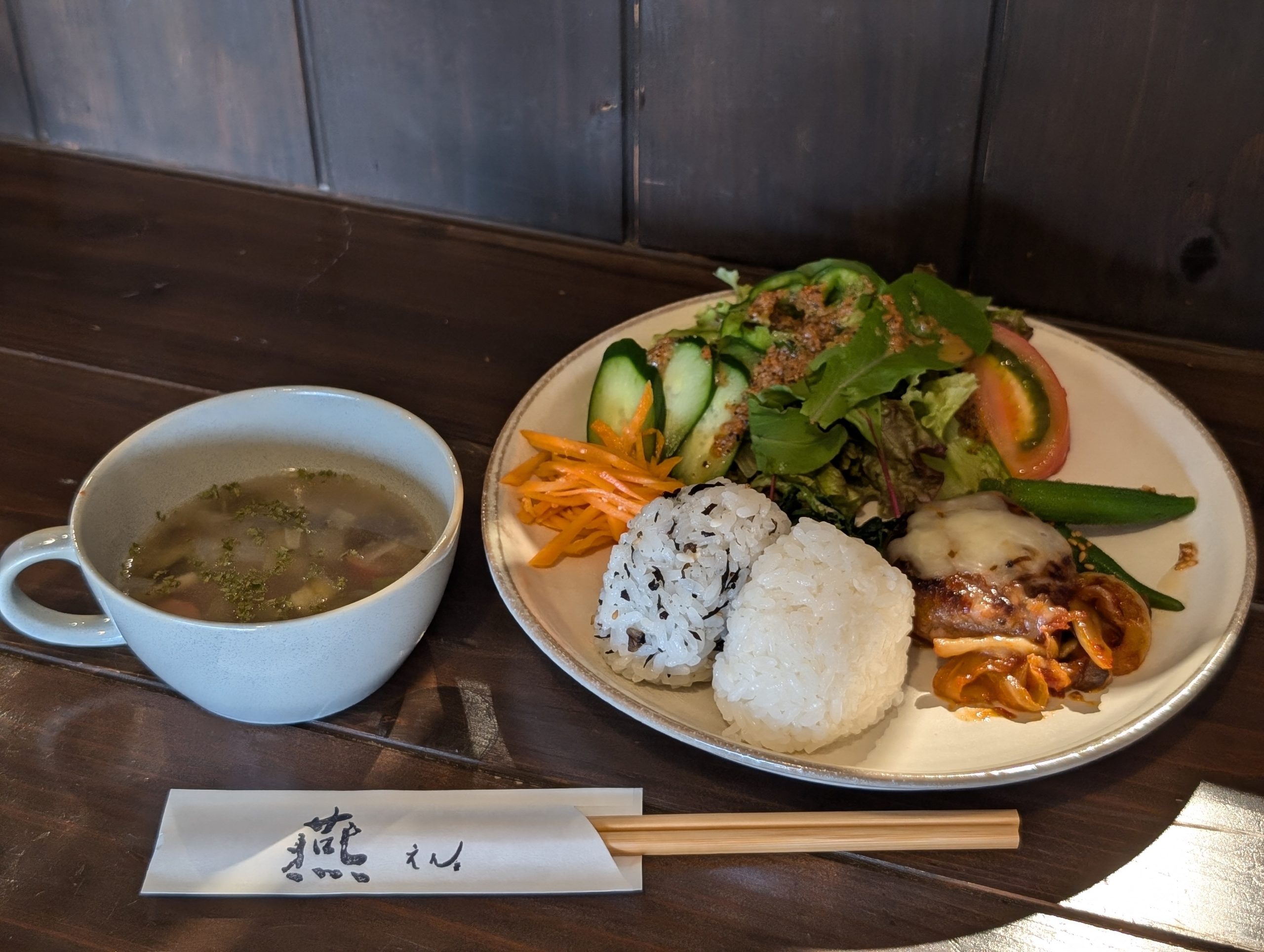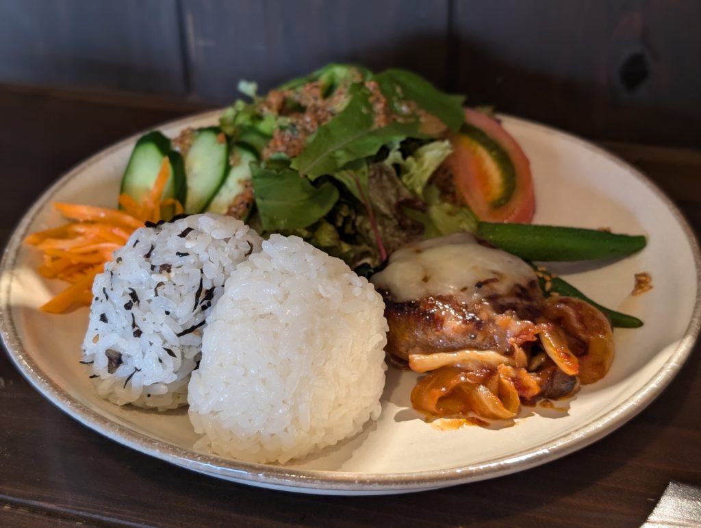 ワンプレートにはおにぎり、ハンバーグ、野菜です。おにぎりは塩麹が入っていて、甘みを感じ、ふわっと食感でツヤツヤしていました。サラダには手作りドレッシングがかかっています。人参やおくらには塩麹や白だしなどで味付けしていますが、優しい味付けでほっこりしました。ハンバーグはふわふわで風味豊かでした。