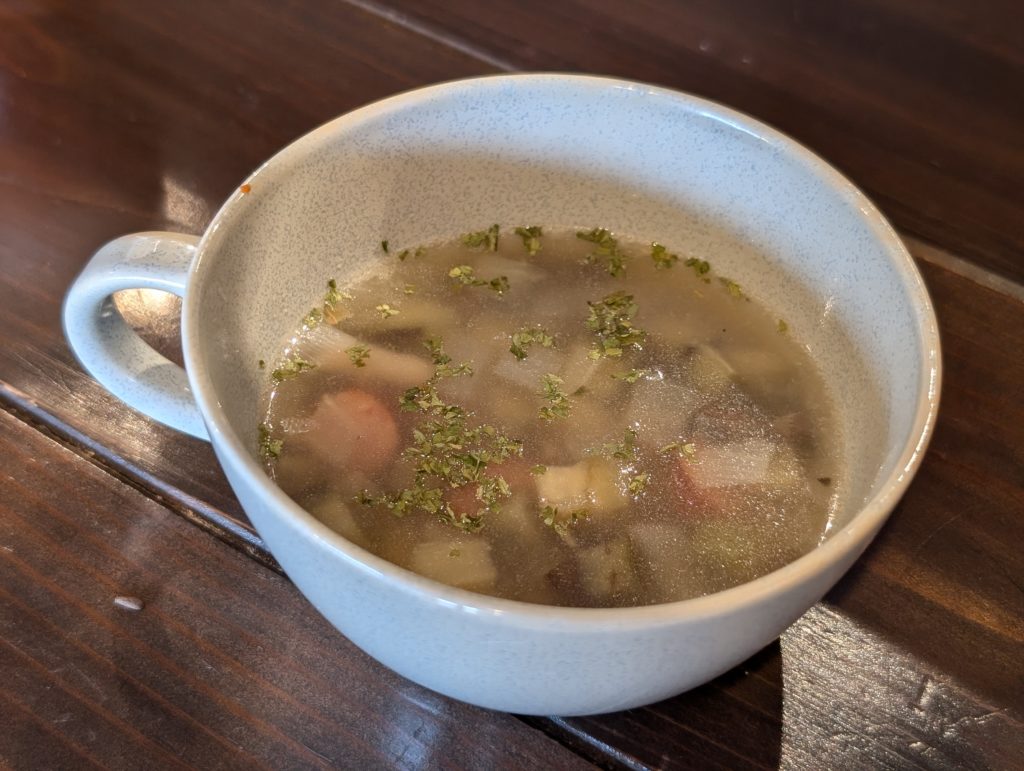 塩麹のスープです。塩麹を使っているのでコクがあり、ハーブソルトも入っているので口の中に入れるとふわーっとハーブが香りました。