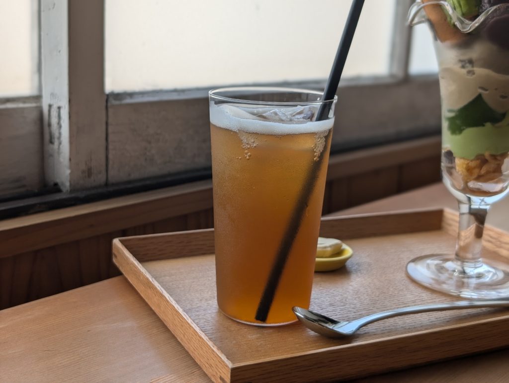 抹茶パフェには抹茶とほうじ茶のアイス、抹茶ゼリー、あんこ、抹茶菓子が盛られていました。お茶のアイスは深い色合いで風味豊かなお茶の味が口にいっぱいに広がりました。