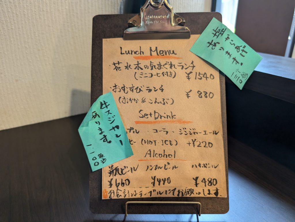 メニューは週替わりのランチやカレー、おにぎりセットとあります。