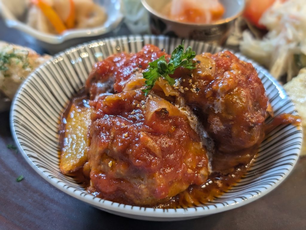 メインはミートボールのトマト煮込みでした。ふわっと食感のミートボールに濃厚なトマトソースはコクがあり、ごはんが進みました。