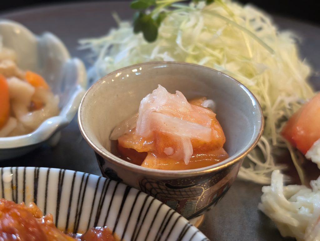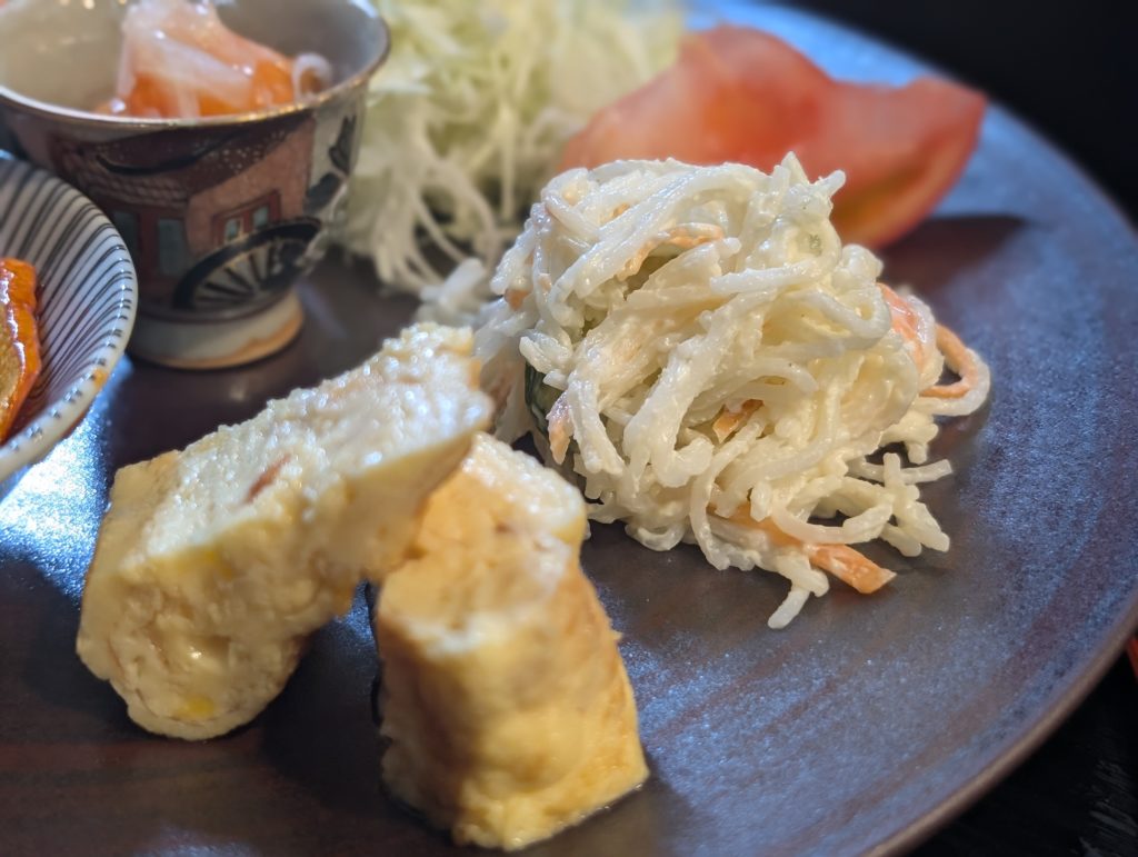 副菜にはビーフンのサラダ、卵焼き、柿と玉ねぎのマリネ、さといものからあげ、切り干し大根です。栄養バランスが整えられた彩り良い副菜となっています。