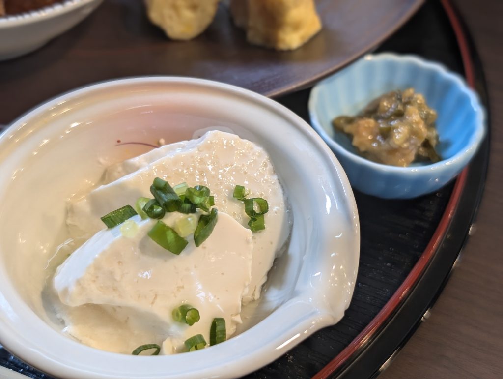 手作りのお豆腐とピーマン味噌です。ピーマン味噌はお豆腐やごはんとの相性抜群でした。