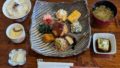 この日の気まぐれランチのかご膳の内容はとり天の南蛮タレ、切り干し大根、さつまいものごま和えサラダ、卵焼き、フルーツゼリーでした。