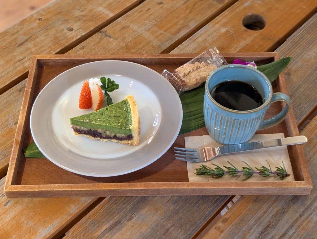 昼カフェ(12時~17時)はほうれん草とあずきのナッツタルトケーキセット(780円)です。