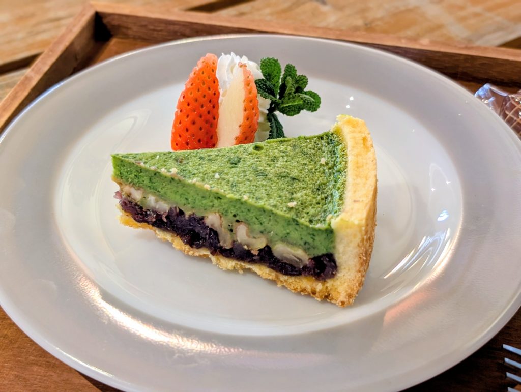バター香るタルト生地の上にはあずき、ナッツ、ピューレ状にしたほうれん草のクリームとなっています。ほんのりほうれん草の香りと優しい甘さのあずきと少し塩味のあるナッツが口の中で絶妙なバランスです。ホールでの注文の場合は3,800円(予約制、持ち帰りの箱付き)となります。
